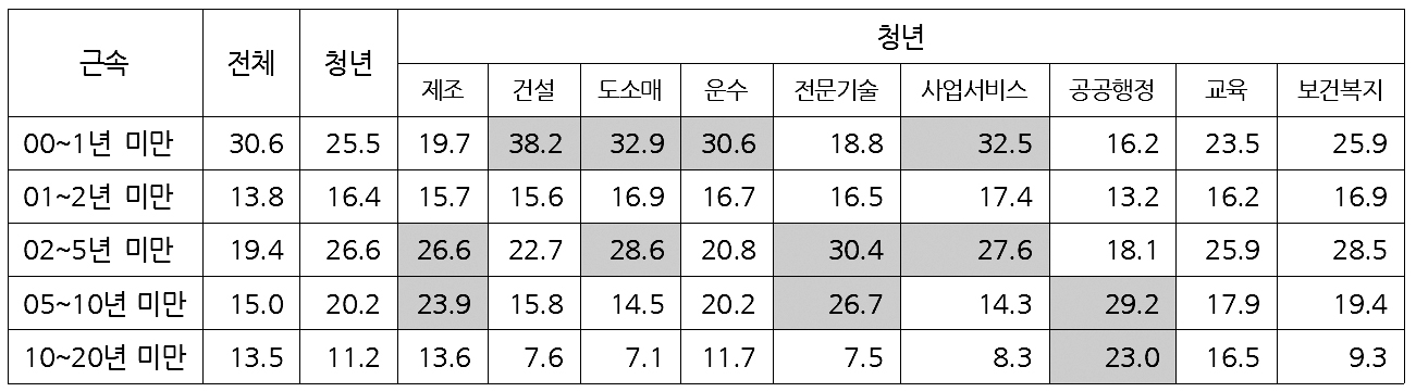 청년노동자의 근속년수는 업종별로 크게 다르다. 건설·도소매·운수업·사업서비스업에서는 1년 미만 노동자 비중이 높지만, 제조·전문기술·공공행정·교육업에선 2~3년 이상 되는 노동자 비중이 60~70퍼센트다.