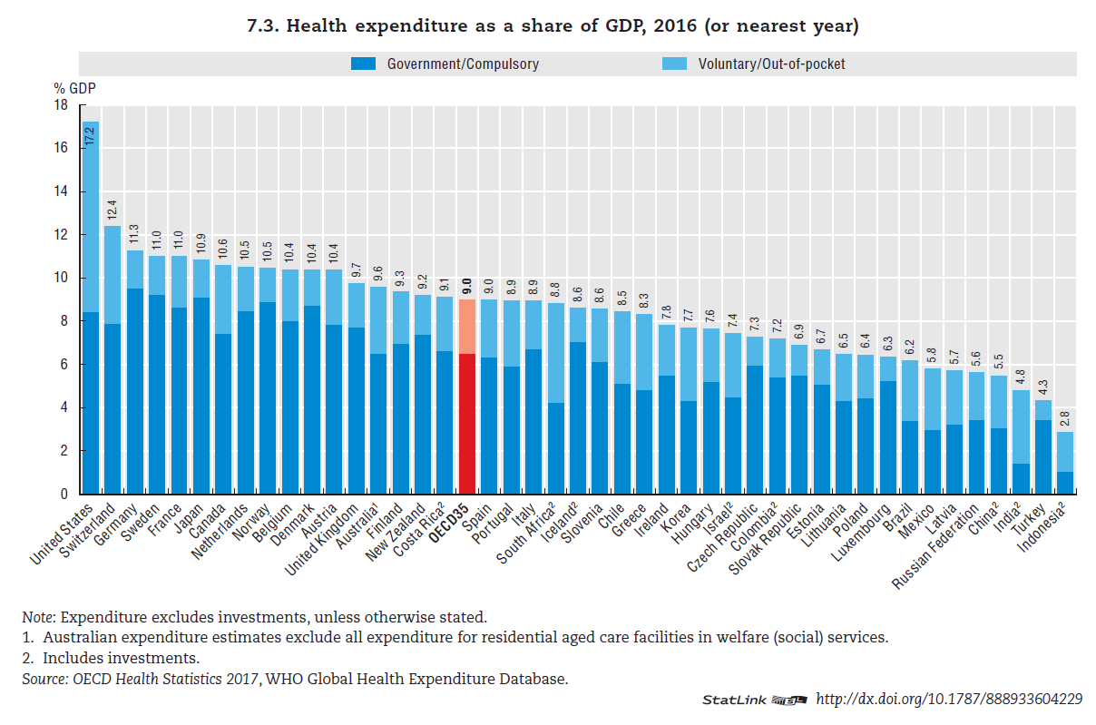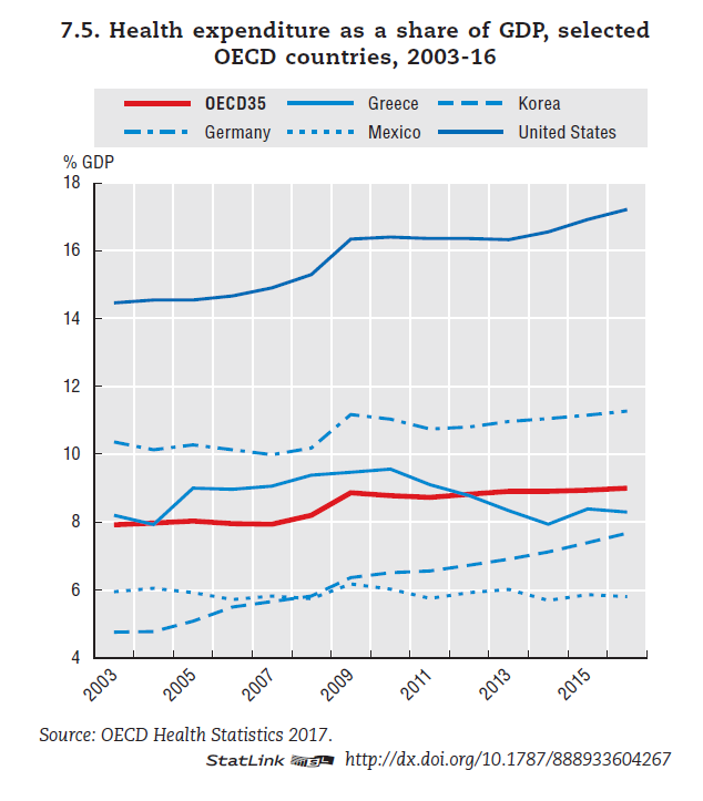 그렇다면 이 국가들의 의료비 지출 양상도 전부 비슷할까? 그렇지는 않다. 물론 지속적인 의료비 증가는 대부분의 OECD 국가들이 공유하는 문제다. [그림1]은 OECD 국가들의 의료비 지출이 GDP에서 차지하는 비중을 나타낸 것이다. 이 중 OECD 국가 평균치는 2003년부터 2016년까지 1퍼센트 정도 꾸준히 증가했다. 하지만 미국의 경우는 같은 기간 그 비중이 2.5퍼센트 증가했다. OECD 내에서도 미국의 의료비 증가 폭이 경제성장 속도보다 유난히 높다고 할 수 있다. GDP에서 의료비 지출이 차지하는 비율도 국가 간 격차가 크다. [그림2]를 보면, OECD 평균은 9퍼센트인데 반해, 미국은 17.2퍼센트로 독보적인 1위를 차지한다.