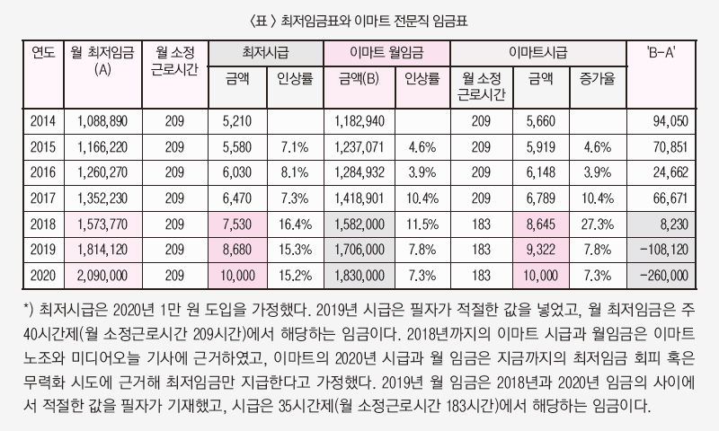 그런데 2017년에 적용될 최저임금이 시급 기준 6,470원으로 인상되었다. 2016년 6,030원이었으니 440원이 오른 것이고 인상률은 7.3퍼센트였다. 주 40시간 노동자(월 소정근로시간 209시간)의 월 최저임금은 2016년 약 126만 원에서 2017년 약 135만 원으로 약 9만 원이 올랐다. 2016년에도 기본급은 2퍼센트만 올렸던 이마트는 이 부담스러운(?) 최저임금 인상을 무력화하기 위해 편법을 동원한다. 2017년에도 기본급은 여전히 2퍼센트, 월 기준 1만 3000원만 인상하고 대신 400퍼센트 주던 성과급 중 200퍼센트를 매월 나눠서 지급한 것이다. 이러면 최저임금 산입범위 임금이 그 전해에 비해 10.4퍼센트 오른다.(<표 1>을 참조하라) 실제로 지급하는 임금은 거의 올리지 않으면서도 최저임금 기준을 위반하지 않게 된 것이다. 중소사업장에서 왕왕 벌어지고 있던 일이긴 하지만 2016년 매출액이 거의 12조에 이르고 영업이익이 6000억 원이 넘는 이마트에서까지 이런 일이 벌어지고 있었다는 것을 알고 있는 이들은 많지 않았으리라.