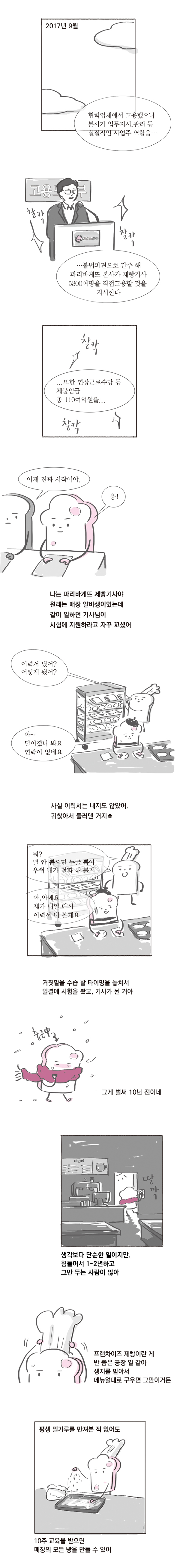 단결툰 2018/01 제36호 프린트 슬기로운 제빵 생활 프랜차이즈 제빵사 김식빵이 거둔 의문의 1승 이재임 ※ 이 만화는 전국화학섬유산업노조 파리바게뜨지회 인터뷰를 통해 구성됐습니다. 오늘보다 나은 내일을 향한 우리의 전망, 오늘보다 정기구독 Twitter Facebook 주제어 태그 노동자 오늘보다 대중운동 트레바리 독서