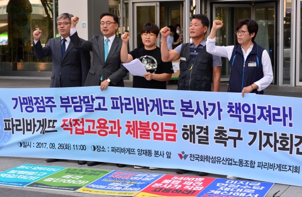 제빵업계 1위를 달리는 파리바게뜨는 SPC그룹 산하의 프랜차이즈 빵집이다. 전국에 3천400개(직영점은 40여 곳이며, 미국 등 해외에 별도 해외법인으로 60여 개 운영)의 매장을 유지하고 있지만, 대부분 프랜차이즈 가맹점들이다. 여기서 알바 노동자들은 가맹점에서 고용하고, 각 매장에 1~2명씩 있는 제빵기사들은 협력사 소속이다. 전국적으로 협력사 제빵기사만 5000명에 달한다. 원청 파리바게뜨 사업을 운영하는 ㈜파리크라상의 지난해 영업이익은 665억 원이었다.