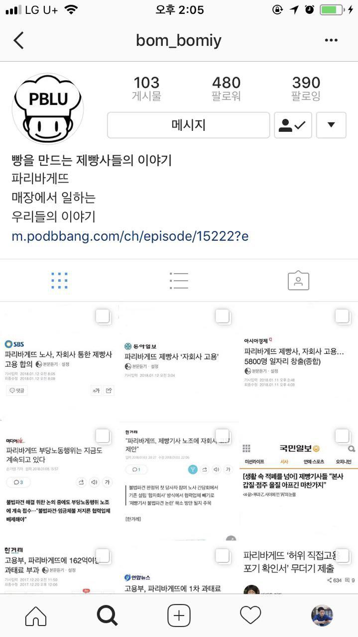 #파리바게뜨 #파리바게뜨기사 #파리바게뜨노조 등 걸 수 있는 해시태그는 다 걸었다. 다른 노조와 달리 유독 인스타그램이 유용한 이유는 최근 20~30대가 가장 많이 쓰는 소셜미디어이기도 하고, 보통 제빵기사들은 자신이 만든 빵과 케이크를 인스타그램에 올리는 걸 좋아하기 때문이다.