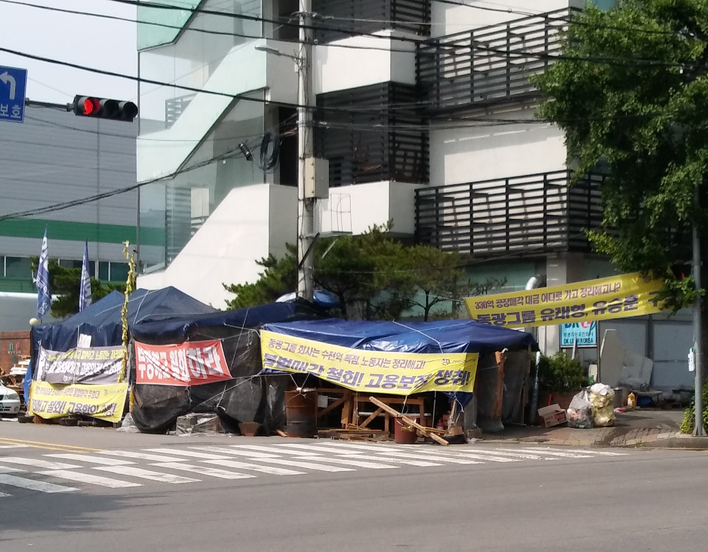 매일 출근하던 공장 앞에 농성장이 차려졌다. 인도 위에 아슬아슬하게 얹힌 두어 개의 천막. 그 옆으로 차들이 위태롭게 지나간다. 경인고속도로와 방음벽을 사이에 둔 동광그룹 본사 에스에이치글로벌 건물 앞 동광기연지회 노동자들의 농성장이다. 농성장 앞에서 열린 문화제에서는 나무를 얼기설기 엮어 만든 무대가 차려졌다. 본사 벽에는 중노위 판결을 환영한다는 커다란 현수막이 무심히 붙어 있다. 부당해고를 인정하라는 지노위 판정이 나왔을 때는 아무 반응이 없던 회사가 자신들에게 조금 유리한 중노위 판정이 내려지자마자 내건 현수막이다.