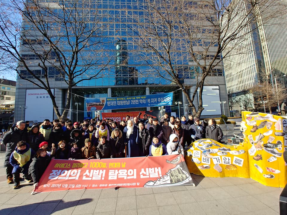 2년 전 문재인 대통령은 야당 대표 시절 하이디스 문제 해결을 위해 노력하겠다고 약속했다. 하지만 당선된 지 반년이 넘게 지난 지금까지도, 지노위에서 부당해고 판결을 받은 지 몇 달이 지난 지금까지도 복직을 위한 하이디스 노동자들의 투쟁은 이어지고 있다. 아침·점심·저녁으로 청와대와 국회 앞에서 선전전을 하고, 수요일 저녁이면 문화제를 연다. 12월 말을 기준으로 정리해고 후 약 1000여 일, 국회 앞에서 농성투쟁을 시작한 지 200여 일, 청와대 앞에서 농성을 시작한지는 50여 일째에 달하는 긴 싸움이다.