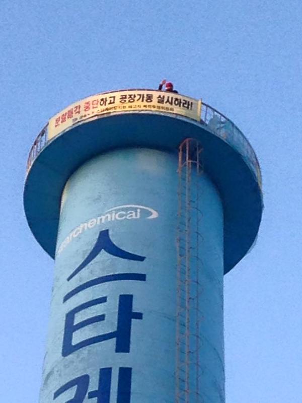 많은 수의 조합원들이 공장을 포기하고 뿔뿔이 흩어진 2014년 5월. 당시 스타케미칼지회 지회장이었던 차광호는 공장 안 45미터 굴뚝에 올랐다. 408일에 달하는 고공농성의 시작이었다. 농성 때문에 공장을 매각하지 못해 애가 타던 스타플렉스 자본은 차광호를 내려오게 하려고 고용 보장, 노동조합 및 단체협약 체결, 생계 및 생활 보장을 약속한 합의서를 작성했다. 농성이 끝나고 이 합의를 이행하기 위해 타폴린 천을 생산하는 파인텍 공장이 세워졌다.