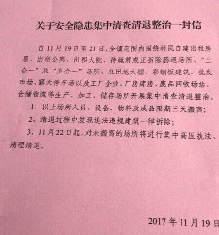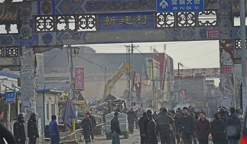 베이징 시장 차이치(蔡奇)는 40일 안에 도시 전반에 걸친 비공인 건축물 철거를 공언했다. 창고·공장·시장·거주단지만이 아니라, 슈퍼마켓이나 관광명소 등 공공장소도 포함했다. 다음날인 19일부터 빨간색 종이쪼가리가 나돌기 시작했다. 퇴거 명령서였다. 어떤 날인도 찍혀있지 않은 익명의 명령서였다. 명령서는 불이 난 마을을 포함한 시홍먼 전역의 주민들에게 3일 내 퇴거할 것을 명령했다. 모든 비공인 구조물의 철거를 예고하면서 말이다. 사흘이 지난 11월 22일 이후에도 떠나지 않은 이들은 공권력의 진압을 마주하게 될 것이라는 경고도 덧붙였다. 한데 단 하루 만에 베이징 시내 곳곳에서 강제퇴거가 시작됐다. 전기와 수도가 예고 없이 차단됐고, 120여 개의 도소매 시장도 쓸렸다. 25개의 농산물 시장은 올해 안에 철거될 예정이다. 갑작스러운 퇴거 조치에 상인들은 어떤 대책도 세우지 못한 채 전전긍긍하고 있다.