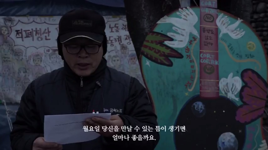 부제로 달린 “무릎 끓고 사느니보다 서서 죽기를 원한다”라는 문장은 본격적인 민중가요가 만들어지기 전까지 가장 많이 불렸다는 일명 ‘훌라송’의 가사 한 구절이기도 하다. 영상의 말미에서 노동자들과 연대자들이 모여 서서 환하게 웃으며 훌라송을 각자의 상황에 맞게 개사해 부르는 장면은, 이 비장하고 결의 어린 다짐의 실천도 결국 함께하는 소소한 시간들 위에서 가능하리라는 사실을 말해주는 듯하다. 서촌궁중족발에서 1월 14일까지 열리는 제5회 도시영화제에 가면 ‘끝나지 않는 편지’를 비롯해 도시의 투쟁에 관해 만들어진 여러 영상들을 관람할 수 있다.