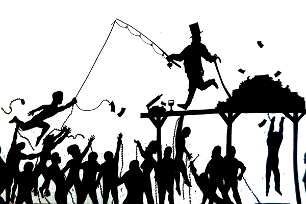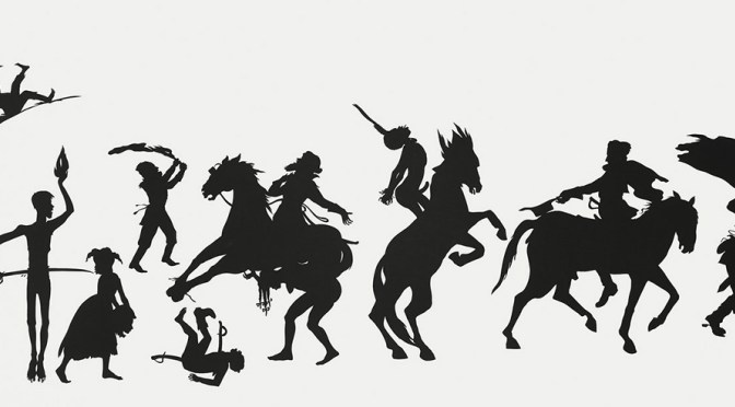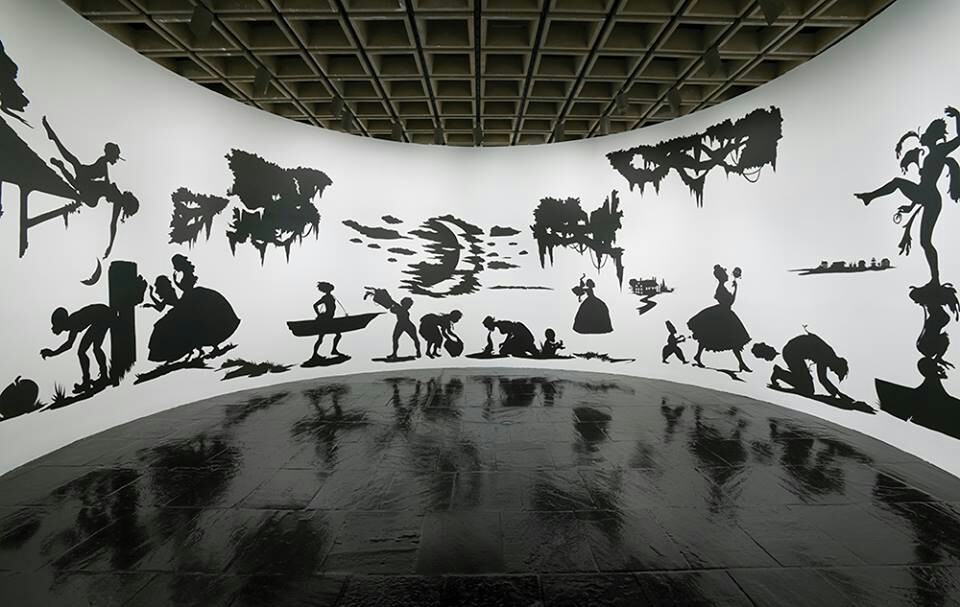 미국의 미술가 카라 워커는 1969년 캘리포니아에서 태어나 열세살에 조지아 주의 아틀란타로 이주하면서 인종차별과 아프리카계 미국인으로서의 정체성에 눈을 뜨게 되었다. 검은 종이를 잘라 윤곽선만으로 사람의 형상을 표현하는 그녀의 작품은 얼핏 보면 19세기 빅토리아 풍의 우아한 실루엣 그림처럼 보인다. 자세히 들여다보면 그제야 내용이 제대로 보인다.