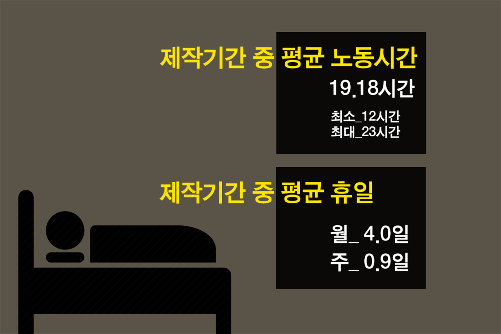 ‘tvN혼술남녀 신입조연출 사망사건 대책위원회(이하 대책위)’에서 진행했던 방송노동현장에 대한 제보센터에 4월 18일부터 4월 24일까지 제보된 응답 중 유효응답 106건을 분석한 결과 방송업계 노동자들의 하루 평균 노동시간은 19.18시간에 달했다.