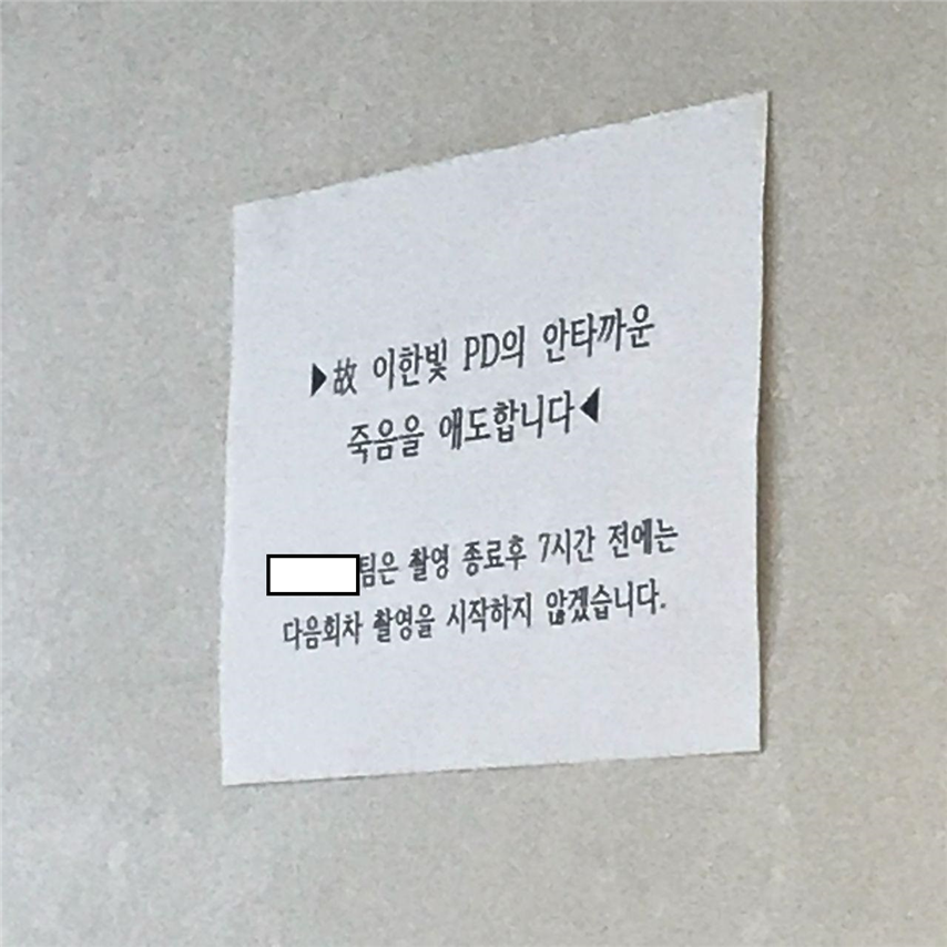 사건 해결 후, 현장은 바뀌었는가? 씨제이 이엔앰은 지난 6월 유가족과 대책위에 사과를 하며 재발방지 대책을 수립하겠다고 약속했다. 추모제가 있던 기간, 현장에서 더 이상 누구도 쉽게 욕을 하지 않는다는 스태프의 증언도 있었다. 대책위의 활동 기간 우리는 “원래 그런 것은 없다”는 걸 확인했다. 한 드라마 촬영 현장에는 “고 이한빛 피디의 안타까운 죽음을 애도하며 OOO팀은 촬영종료 후 7시간 내에는 다음 회차 촬영을 시작하지 않겠다”는 문구를 촬영 현장에 붙이기도 하였다. 대본 앞에는 “이 드라마를 위해 촬영하는 모든 노동자들에게 감사를 표한다”는 문구가 들어가기도 한다.