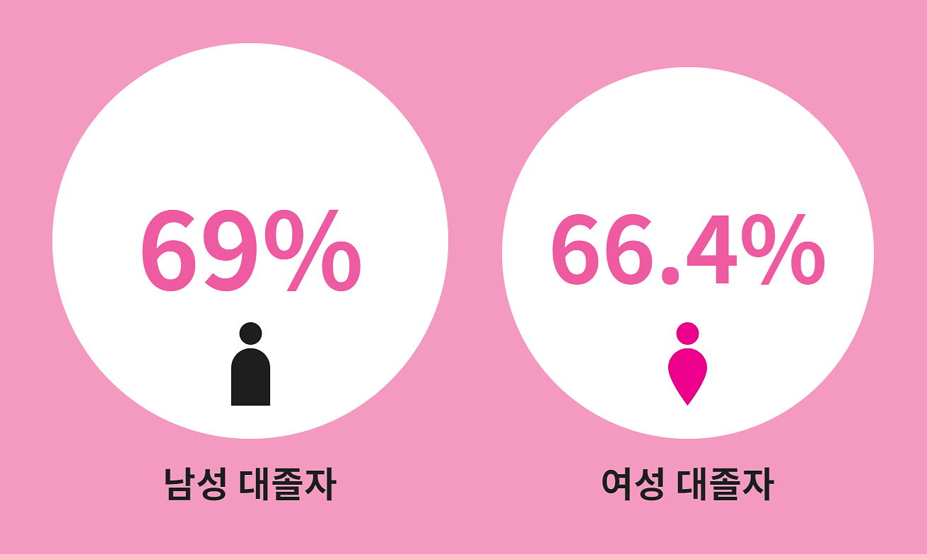 청년 여성들의 노동 현실을 구체적으로 살펴보자. 사실 20대 여성의 고용률이 남성보다 높게 나오는 것은 일종의 착시라 할 수 있다. 정확한 고용률을 확인하려면 학력별 졸업자를 나눠서 봐야 한다. 대졸은 고졸보다 고용률이 두 배 가량 높은데, 여성은 남성보다 대졸자가 많고, 남성은 군복무 등으로 재학 기간이 길어 여성보다 늦게 노동시장에 진입하기 때문이다. 이러한 조건을 고려하지 않으면 여성의 고용률이 높아 보이나 학력별로 집단을 나눠보면 다른 사실이 드러난다. ‘청년여성 취업애로요인 해소를 위한 정책과제’의 분석에 따르면 2013년 경제활동인구조사에서 15~29세 인구 가운데 고등학교 졸업자인 남성의 고용률(38.5퍼센트)은 여성(36.1퍼센트)에 비해 높다. 대학졸업자도 마찬가지로 남성이(76.1퍼센트) 여성(72퍼센트)보다 높다. 최근자료인 ‘2016년 고등교육기관 졸업자 취업통계’에서도 대졸 남성 취업률이(69퍼센트) 여성(66.4퍼센트)보다 높다.