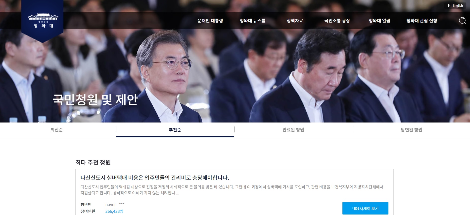 촛불 이후 폭발적이진 않지만 노동조합이 곳곳에서 조직되고, 재벌의 갑질에 대한 고발이 이뤄지고, 미투운동도 벌어지고 있다. 그러나 이 모든 이슈를 빨아들이는 곳이 있으니 바로 문재인 정부 취임 100일을 맞아 청와대 홈페이지에 개설한 ‘국민청원 및 제안’ 게시판이다. 청원 동참자가 30일 동안 20만 명을 넘으면 정부 및 청와대 관계자가 답변을 하게 된다. 포털과 SNS계정을 통해 로그인 한 뒤 댓글을 달면 청원에 동참할 수 있다. 문재인 대통령은 ‘출범 100일 대국민 보고’에서 “국민들은 간접 민주주의로는 만족하지 못한다. 정부의 정책도 직접 제안하는 직접민주주의를 국민께서 요구하고 있다”고 발언하면서 이 게시판을 개설했다.