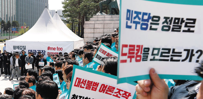 그러나 청와대와 민주당도, 자유한국당 등 야당도, 조선일보 같은 언론도 ‘댓글 정치’에만 온 신경을 곤두세운다. 댓글과 추천수가 상당히 큰 영향을 미친다는 생각에 빠져 있는 것이다. 4월 19일자 조선일보 기사에 따르면, 청와대와 조선일보 둘 다(서로 의도는 전혀 다르지만) 지난 남북단일팀과 비트코인 정책으로 인한 것으로 분석된 지난 1월 문재인 대통령 지지율 10퍼센트 하락이 드루킹의 조작 때문이라고 말한다. 자유한국당은 대통령의 높은 지지율이 극렬 지지층의 댓글 작업이 아니냐며 의심한다. 전형적인 음모론적 사고다. 이들이 볼 때 시민들은 댓글과 추천수 조작에 쉽게 의견을 바꾸는 수동적이고 우매한 이들에 지나지 않는다. 정치의 위기는 바로 이 지점에서 강화되고 있다.