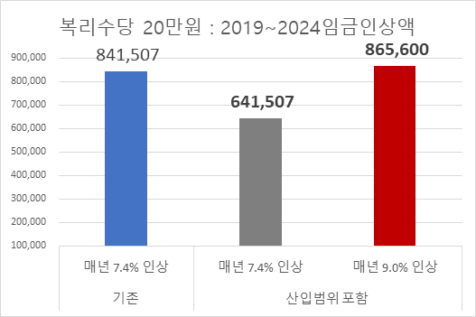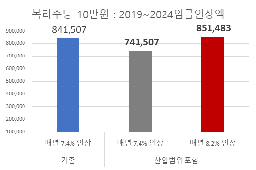박근혜 정권 시절 최저임금 인상률은 평균 7.4퍼센트였다. 2019년 최저임금부터 7.4퍼센트씩 인상된다고 가정했을 때, 2024년까지 임금인상 총액은 84만 원이다. 그런데 복리후생수당 10만 원, 20만 원이 산입범위에 포함될 경우, 2024년까지 임금인상액은 10~20만 원씩 줄어든다. 이렇게 줄어든 임금인상 삭감분을 만회하려면, 6년 동안 최저임금은 평균 8.2~9.0퍼센트씩 인상되어야 한다. 바꿔 말하면 최저임금이 연평균 8.2~9.0퍼센트씩 인상되지 않으면, 복리후생수당 10만 원, 20만 원을 받던 이들은 박근혜 정권 시절보다 임금인상이 억제된다.