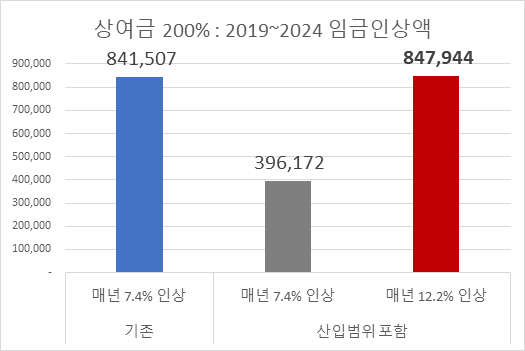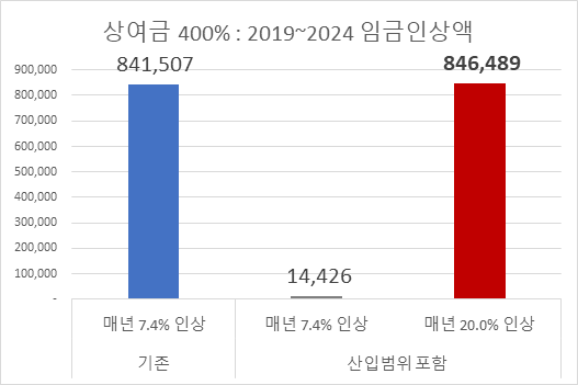 상여금을 산입범위에 포함시킨 경우 임금인상 삭감액은 더 많다. 상여금 200퍼센트를 산입범위에 포함시켰을 경우, 삭감액은 33.8만 원이나 된다. 상여금 400퍼센트의 경우는 59.4만 원이 줄어든다.