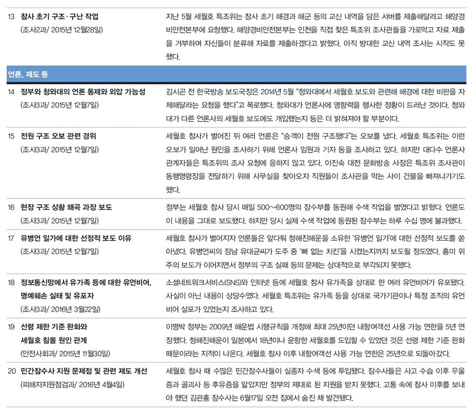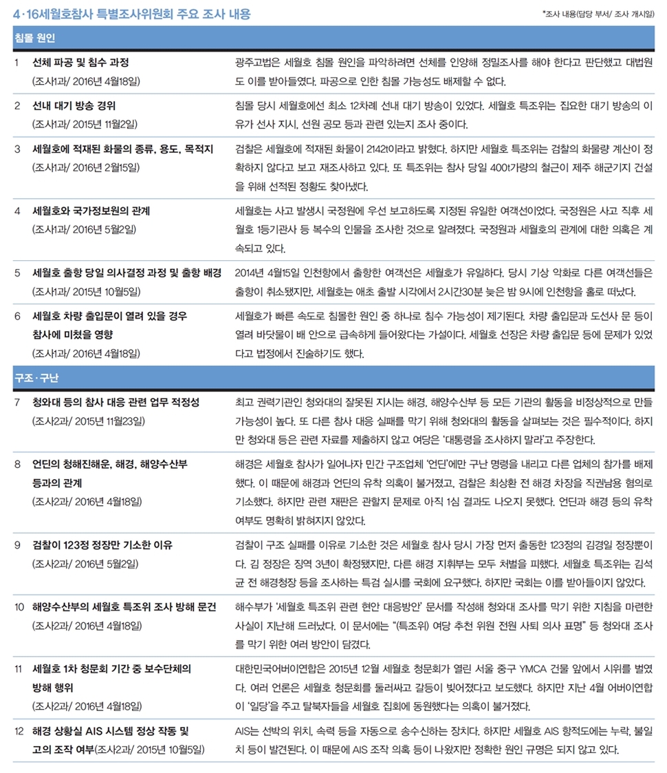 지난 5월 10일, 옆으로 누워있던 세월호가 바로섰다. 이제 그 동안 진입이 어려웠던 구역에서 미수습자 수습과 조사가 이뤄진다. 선체조사위원회의 조사결과는 8월에 발표될 예정이다. 가습기 살균제 사건 및 세월호 참사의 진상규명과 안전사회 종합대책 등을 다루는 사회적 참사 특별조사위원회도 3월 말 출범했다. 조사관 채용 후 8월경부터 선체조사위원회가 미처 밝히지 못한 과제를 포함하여 구조구난의 문제점 등도 다시 조사를 시작할 것이다. 세월호가 바로 서고, 사회적 참사 특조위가 본격적인 활동을 앞두고 있는 지금, 4년 여에 걸친 세월호 참사 진상규명 과정을 평가할 필요가 있다.