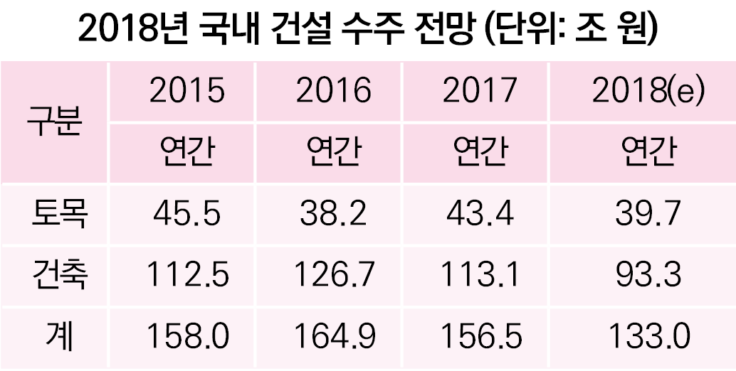 연일 경기가 침체된다는 보도가 이어지는 가운데 일부에서는 대대적인 건설투자가 필요하다는 주장이 제기되고 있다. 투자 부진이 이어지는 상황에서 경기 부양과 일자리 창출을 위해서 건설산업에 투자해야 하고, 정부가 사회간접자본(SOC) 예산 확대 등을 통해 길을 마련해야 한다는 것이다. 실제로 2018년 사회간접자본 예산은 2017년에 비해 14.4퍼센트 감축된 18.9조 원으로 책정되었다. 국회 예산정책처는 2017년 사회간접자본 예산은 향후 5년간 연평균 7.5퍼센트씩 감소하리라 전망하기도 했다. 2018년 국내 건설 수주 전망 또한 2017년의 156.5조 원에 비해 15퍼센트 하락한 133.0조 원으로 예상된다.