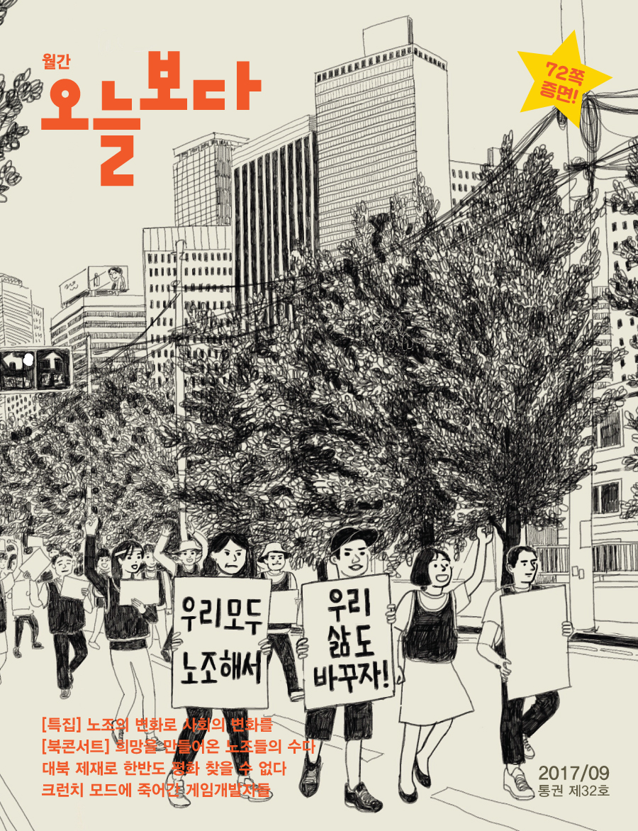 무엇보다 눈에 띄는 것은 《오늘보다》의 간판 코너, ‘단결툰’과 ‘노조할권리’가 시작된 겁니다. 창간호부터 꾸준히 많은 인기를 얻었던 코너이기도 하죠. 딱딱하게만 느껴지는 노동조합에 대한 이야기를 재밌는 스토리로 구성하여 언제 봐도 새롭다는 좋은 평가를 받은 기획이기도 합니다. 단결툰에 등장한 대부분의 주인공은 노조의 ‘ㄴ’자도 몰랐거나 노조에 대해 안 좋은 선입견을 품었던 이들이었습니다. 그런 평범한 이들이 노동조합을 만나며 삶이 어떻게 바뀌는지 보여주고자 노력했습니다. 많은 독자분들이 단결툰과 노조할권리를 좋게 봐주신 이유라고 생각해봅니다.
