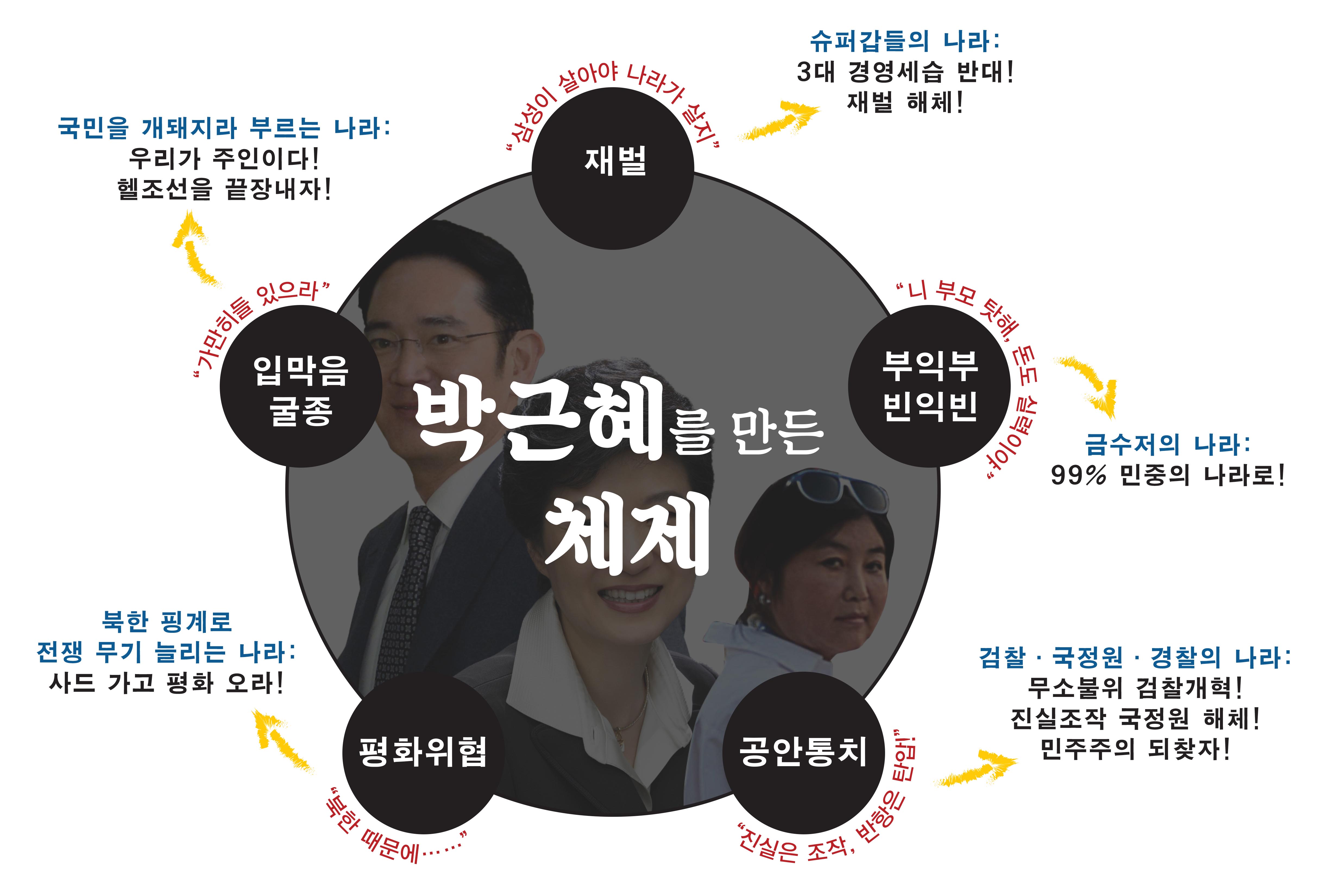 《오늘보다》는 박근혜-최순실 뒤에 숨어있는 재벌의 문제에 주목했습니다. ‘부를 독식하고 손실을 사회화’하여 ‘금수저의 나라’를 만든 장본인들이 거액의 돈으로 나라 살림까지 제 맘대로 갖고 놀았던 거죠. 그 때문에 재벌 세상을 끝장내고 부익부 빈익빈의 체제를 없애야 진짜 ‘박근혜를 만든 체제’를 없앨 수 있다고 소리쳤습니다. 한편으로는 촛불의 기운을 각자의 일터와 삶터로 확장하자는 주장도 펼쳤습니다. 국민들이 직접 경험한 ‘민주주의’를 광장에서 하루 머물다가는 축제가 아닌 ‘진짜 내 삶의 변화’로 만들어야 앞으로 사회의 변화를 이끌어 갈 힘이 될 수 있다고 보았기 때문입니다. 실제로 촛불 이후 노동조합 조직률이 2008년 이후 최고치인 10.7퍼센트를 갱신하는 등 긍정적인 효과도 있었습니다.