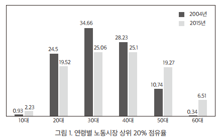이철승 교수의 분석에 따르면 60년대생들은 이전 세대들과 비슷하게 20대 중반에 입사해서, 이전 세대보다 빠르게 소득이 증가했고, 더 오래 정점에 머무르고 있다. 이러한 현상은 고졸 이하 생산직이나 대졸 이상 사무직 모두에서 나타난다. 50대의 노동시장 상위 20% 점유율이 지난 10년간 크게 증가했다. 2004년 50대의 노동시장 상위 20% 점유율은 11%인 반면, 2015년에는 19%다. 이전 세대보다 더 오래 노동시장에서 생존하고 있는 것이다. (그림 1 참조)