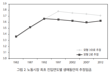 국회예산정책처 심혜정 과장의 「연령-소득 프로파일(age-earnings profile) 추정을 통한 세대 간 소득격차 분석」 에 따르면 1997년 이전에 노동시장에 진입한 세대의 경우 그 이전 세대보다 생애전체의 소득수준이 뚜렷이 개선되지만, 그 이후의 세대는 정체한다. (그림 2 참조) 그 이유는 1997년 이후 노동시장 진입임금의 상승이 정체되거나 하락했기 때문이다. 진입임금의 정체 내지 하락은 생애주기 전체의 소득커브에 영속적으로 영향을 미친다. 즉 연령 증가에 따른 소득상승률도 낮다.