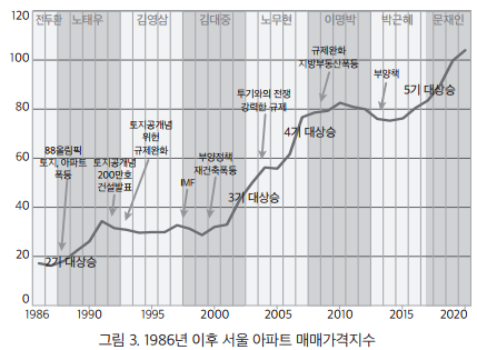 『386 세대유감』의 저자들은 86세대가 1989년 제1기 신도시 개발계획 이후 1991년 주택 200만 호 공급 시기에 분당, 일산, 평촌 등에 입주하면서 수도권 아파트 가격 상승에 가장 많은 혜택을 보았다고 추론한다. 이 시기에 86세대가 사회에 진출했기 때문이다. 또한 당시에 도입된 주택청약제도와 주택금융규제 완화의 혜택도 받았다고 본다. (그림 3 참조)