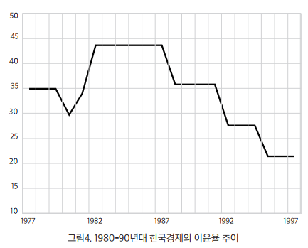 마르크스주의적 관점에서는 윤소영 교수가 『이윤율의 경제학과 신자유주의 비판(2001)』에서 제시한 한국경제분석을 참고할 수 있다. 이 분석은 자본축적의 추세선으로부터 이윤율의 추세선을 도출한다. 1979-80년 경제위기를 계기로 한국 경제는 중화학공업화에서 신자유주의로 이행한다. 이윤율은 1977-79년 34.9%에서 80년 29.7%, 81년 34.0%에서 82-87년 43.6%로 상승한다. 그러나 1986-88년 3저 호황과 1989년 그것이 끝난 이후 오히려 재벌 체제가 강화된다. 수익성을 무시한 재벌의 과잉투자로 인해 또다시 이윤율이 하락하면서 87년 48.0%까지 상승했던 이윤율은 88-91년 35.8%, 92-94년 27.6%를 거쳐, 95-97년 21.4%로 급속히 저하한다. ‘지각한 88-89년 공황’이라 부를 수 있는 97-98년 공황은 한국 경제의 장기불황을 예고한다고 끝맺는다. (그림 4 참조)