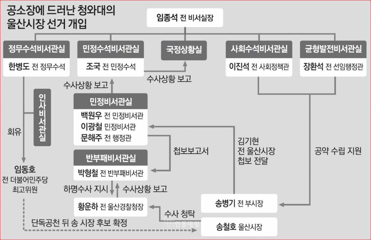 광흥창팀 13명 중 양정철 등을 제외한 10명이 청와대로 들어갔다. 울산시장 선거개입 사건과 관련한 검찰의 기소 내용과 각종 언론기사에 언급되는 청와대 보좌진들 대부분이 82-87학번 운동권 출신이다. 전대협 3기 의장인 임종석 전 비서실장(한양대 86학번)이나 사노맹 출신인 조국 전 민정수석(서울대 82학번)은 말할 것도 없고, 백원우 전 민정비서관(고려대 85학번 전대협 연대사업국장), 한병도 전 정무수석(원광대 86학번 총학생회장)도 마찬가지다. 선거개입 사건의 핵심 증거자료인 ‘송병기 업무수첩’에도 언급되어 있는 임동호 전 민주당 최고위원은 임종석, 김경수 등과 술자리에서 울산시장 경선을 포기하는 대신 오사카 총영사를 제안받았다고 증언한 바 있다. 그 후 임동호는 말을 바꿨고, 이번 총선에서 민주당의 공천을 받은 상황이다. (그림 5 참조)