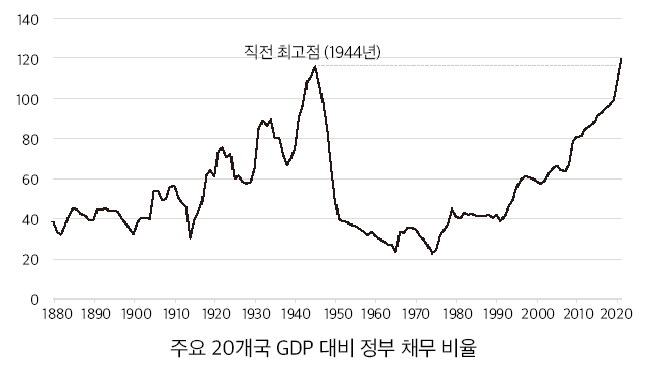 2020년 주요 20개국(G20)의 정부 부채는 국내총생산 대비 120~130%에 달할 것으로 예측된다. 국제통화기금(IMF) 추계에 따르면 이는 2차 세계대전 막판이었던 1944년보다 높은 수치다. 세계금융위기 상처가 치유되지도 않은 상태에서 코로나19로 또다시 정부재정이 직격탄을 맞았다. 세계 각국은 금융시장 안정을 위해 GDP의 10~20%에 달하는 대출과 보증을 제공하고 있고, 실업자 지원을 위해서도 여태껏 없었던 액수의 재정지출을 이어가고 있다. 다만, 이런 상황에서도 화폐 가치의 하락, 즉 인플레이션이 발생하지는 않고 있는데, 채권·채무 관계로 현금을 대신하는 금융시장이 위축되었기 때문이다. 신용이 축소되면서 현금이 그 역할까지 떠맡고 있다 보니, 오히려 현금이 부족해 중앙은행이 수량완화(양적완화) 정책으로 금융시장에 현금을 쏟아붓고 있다. 예로 미국연방준비은행은 코로나19 확산 이후 단 한 달 만에 자산규모를 4조 달러에서 7조 달러로 늘렸다.