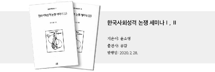 올해 2월 윤소영 선생의 『한국사회성격 논쟁 세미나』가 발간되었다. 이 책은 지난 2015년부터 2018년까지 출판된 4부작을 개정하고 합본하면서 여기에 종합토론과 후기를 추가한 것이다. 4부작의 구성은 『한국자본주의의 역사』(2015), 『한국의 불행』(2016), 『위기와 비판』(2017), 『재론 위기와 비판』(2018)으로 『세미나(Ⅰ)』로 합본해 발간되었다. 2018년 12월에 작성된 『종합토론』과 2020년 2월에 작성된 『후기』는 『세미나(Ⅱ)』로 분책해서 발간되었다. (따라서 하나의 책이라 할 수 있고 앞으론 『세미나』로 통칭한다.) 이는 지난 5년간의 연구작업을 총괄하는 의미가 있다.
