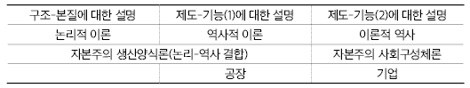 이렇게 생산양식 분석에서 구조-본질과 대비되는 제도-기능과 사회구성체 분석에서 추가되는 또 다른 제도-기능을 구별할 필요가 있다. 윤소영 선생은 전자에 대해서는 이론 내부에서 논리와 대비되는 역사라는 의미로 ‘역사적 이론’이라 부른 반면, 후자에 대해서는 개념적으로 설명된 역사라는 의미에서 ‘이론적 역사’라고 부른다. (표 참고)