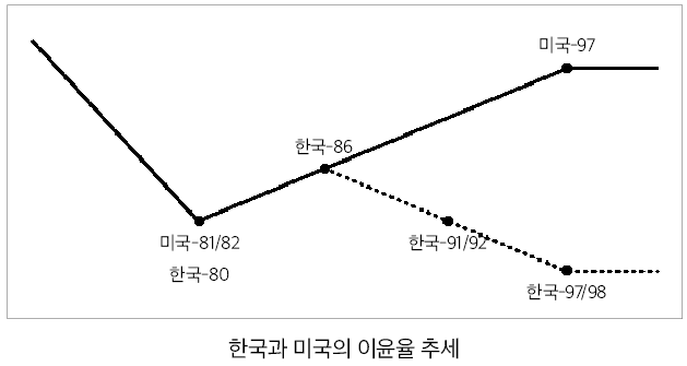 국책연구기관인 한국개발연구원과 하버드대학의 공동연구인 『기적에서 성숙으로』는 남한경제의 자본수익률 추이를 분석하는데, 『이윤율의 경제학과 신자유주의 비판』(2001)에서 윤소영 선생의 이윤율 추이 분석과 거의 동일하다. 1972-75년에 급등·급락하다가 1976년부터 하락세를 지속해 1980년에 저점에 도달한다. 그 후 반등해 1987년 고점에 도달한 이윤율은 1992년에 다시 1980년 저점에 도달하는데, 이 다음에도 하락세를 지속하면서 1998년에는 새로운 저점에 도달한다. 이것을 미국의 이윤율과 비교해보면 확연한 분기를 발견할 수 있다. 이는 즉 불황기에서 반작용요인(이윤율 하락을 상쇄하는 요인)으로 작용하는 금융화가 한국에서는 특수한 형태로 실패했음을 의미한다.