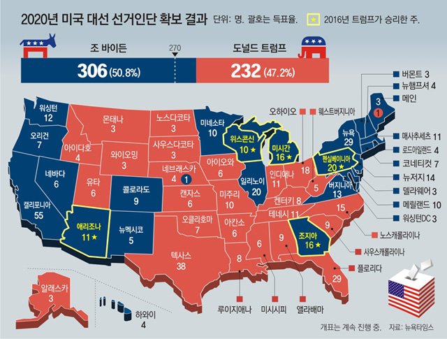 현지 시간 2020년 11월 3일에 치러진 미국 대통령 선거에서 바이든은 선거인단 306명을 확보해 최종 당선되었다. 득표는 바이든 약 8,000만 표(지지율 51%), 트럼프가 약 7,400만 표(지지율 47.1%)를 획득했다. 역사상 가장 중요한 선거라고 평가받았던 2020년 미국 대선에서 바이든 후보가 현직 트럼프 후보를 꺾었다.