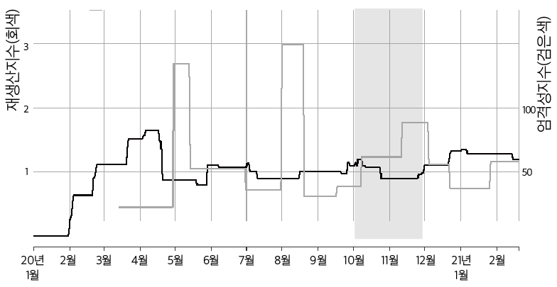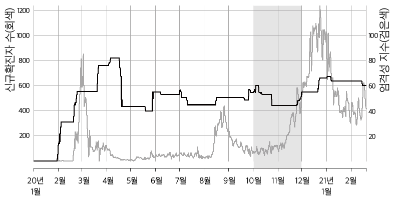 이제 위 주장의 근거를 그래프를 통해 제시해보겠다. 그림 6은 2020년 1월부터 2021년 2월 20일 사이의 신규 확진자 수와 엄격성 지수를 동시에 표시한 것이다. 회색 선이 신규 확진자 수이며 검은 선이 엄격성 지수다. 엄격성 지수가 사회적 거리두기의 강도를 반영한다고 보면 된다. 신규확진자 수와 엄격성 지수는 옥스퍼드 코로나19 정부 대응 추적 프로젝트의 데이터를 이용했다.