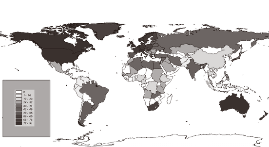 그림 3 홉스테드의 집단주의-개인주의 지표 지도. 동아시아와 동남아시아 국가들은 집단주의적 성향이 매우 강하며, 유럽과 영미권 국가들은 개인주의적 성향이 매우 강하다. 흰색은 자료가 없는 부분이다. (출처: https://geerthofstede.com/)