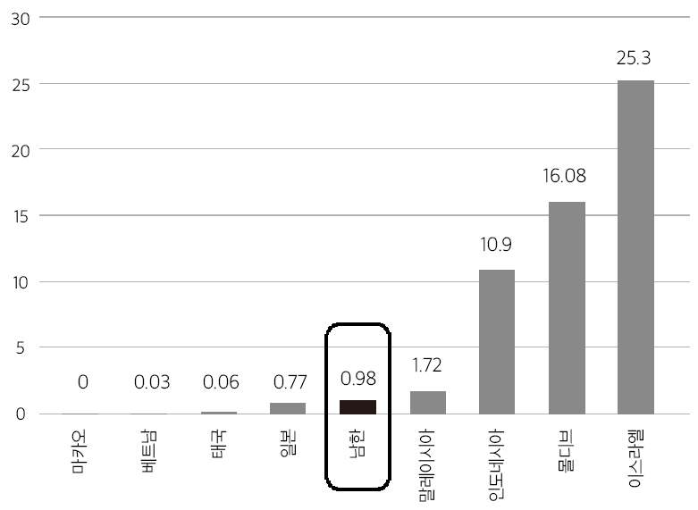 조사 결과를 살펴보자. 대만과 홍콩은 중국으로 인해 조사 대상에서 제외되었다. 남한은 70.2점으로, 분석 대상 12개국 중 73.2점을 받은 태국에 이어 2위를 차지했으며, GHSI 195개 조사국 중에서도 9위에 위치했다. 이런 대처 인프라는 경제적 수준에도 영향을 받지만, 그보다는 역사적 경험이 중요한 것으로 보인다. 분석대상국 중 GHSI 1, 2, 3위를 차지한 태국, 남한, 말레이시아는 사스, 메르스, 신종플루를 모두 겪은 국가다.
