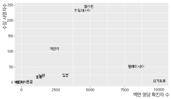 그림 2 백만 명당 확진자 수와 수정사망자 수