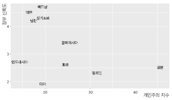 그림 4 분석대상국의 개인주의 지수와 정부 신뢰도