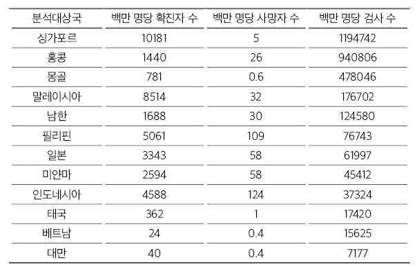 최종적으로 분석에 포함된 국가는 일본, 남한, 대만, 홍콩, 몽골, 인도네시아, 말레이시아, 미얀마, 필리핀, 싱가포르, 태국, 베트남 12개 나라 또는 특별행정구(이하 분석대상국)이다. 각국의 백만 명당 확진자 수, 사망자 수, 검사 수는 국제통계사이트 ‘월드오미터’(Worldometer)에서 가져왔다. 통계 데이터의 신뢰도를 가늠해 볼 수 있는 인구 백만 명당 검사 수는 표 1과 같다. 대체로 문제가 없어 보인다. 대만의 검사 수가 적지만, 코로나19 대응이 매우 성공적이었기 때문에 나타난 결과로 해석할 수 있다.