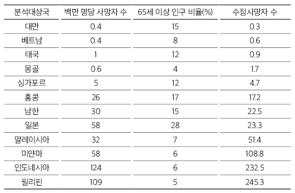 표 2 분석대상국의 수정사망자 수. (출처: 백만 명당 사망자 수는 월드오미터(Worldometer), 65세 이상 인구 비율은 세계은행)