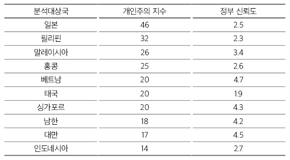 표 3 분석대상국의 개인주의 지수와 정부 신뢰도. 설명과 출처는 본문 참조. 미얀마와 몽골은 자료 없음.