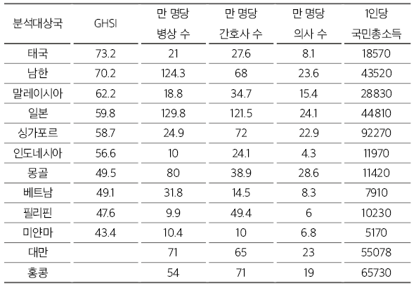 표 5 분석대상국의 감염병 대응 인프라 및 국민소득 비교. 출처는 GHSI 홈페이지, 세계보건기구(WHO), 대만 보건부, 홍콩 보건부