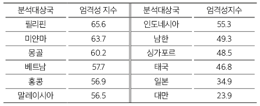 국가 간 비교를 할 때는 아시아 12개 국가 또는 특별행정구를 대상으로 했다. 일본, 남한, 대만, 홍콩, 몽골, 인도네시아, 말레이시아, 미얀마, 필리핀, 싱가포르, 태국, 베트남이다. 아시아 국가만을 포함한 이유가 있다. 코로나19로 큰 타격을 받은 국가는 대개 유럽과 아메리카 대륙에 집중되어 있다. 반면 동아시아와 동남아시아 국가들은 상대적으로 피해가 적다. 원인은 아직 명확히 알려지지 않았지만, 정치문화적 차이점을 핵심 요인으로 지적하는 학자가 많다.