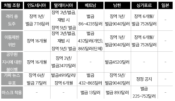 엄격성 지수 외에도 방역 정책의 강도를 평가하는 다른 기준도 있다. 방역 수칙 위반 시 처벌 조항이다. 표 7은 앞서 언급했던 논문에서 말레이시아 연구진들이 정리한 인도네시아, 일본, 말레이시아, 싱가포르, 남한, 베트남의 처벌 조항 비교표다.