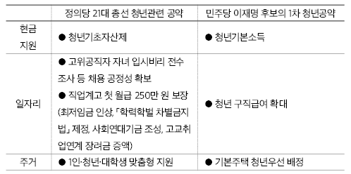 아래의 표는 2020년 21대 총선에서 정의당이 제시한 청년 공약과 민주당 이재명 예비후보가 2021년 8월 5일 발표한 1차 청년공약을 비교한 것이다. (정의당의 청년 공약은 문재인 정부의 청년정책 기본계획 발표 이전에 제시된 것인데, 일부는 문재인 정부의 정책에도 반영되었다.) 언뜻 보기에는 두 정당의 공약이 조금씩 달라 보일 수 있겠지만, 조금만 살펴본다면 많은 부분에서 일치한다는 점을 알 수 있다.