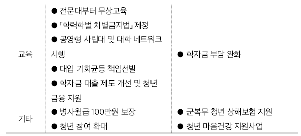 물론 구조개혁에는 상당한 시간이 소요될 것이기에, 기존의 청년대상 지원 정책도 유지될 필요가 있기는 하다. 다만, 1) 노동시장 이중구조가 미치는 효과를 고려하여 한계적 중소기업을 연명시키는 방식의 청년일자리 재정지원은 축소해야 하고, 청년의 이후 경력에 오히려 피해를 줄 수 있는 기업으로의 연결도 줄여야 하며, 2) 청년 집단이 이질적인 상황을 고려하여 차별화된 노동시장 정책을 적용해야 하고, 3) 현재 진행 중인 프로그램에 대한 평가와 환류 시스템을 강화해야 한다.