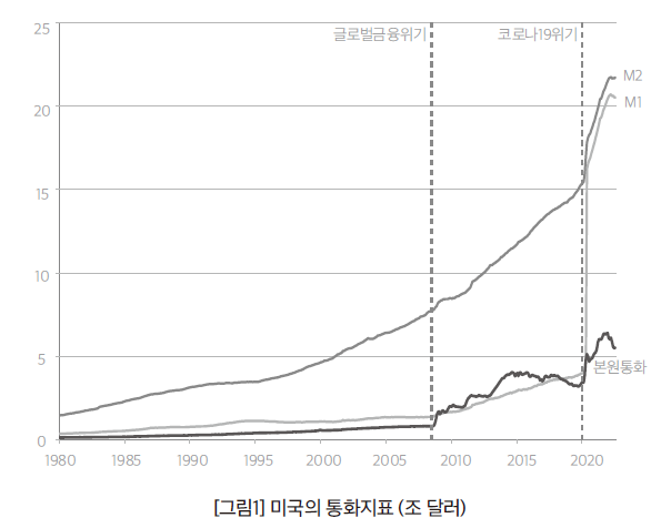 앞에서 서머스나 배로가 지적한 것처럼, 금융위기 이후 연준의 명목금리 목표는 장기간 제로 상태를 유지했고, 대규모 수량완화 정책이 개시되어 연준의 대차대조표는 2008년 8월 0.9조 달러에서 시작해 코로나19 대유행 직전까지 4조 달러로 급증했다. 이를 축소하려는 정책(테이퍼링)이 충분히 진행되기도 전에 코로나19 대유행과 그에 동반된 경기침체가 개시되었고, 연준의 대차대조표는 다시금 거대하게 팽창해 9조 달러에 이르렀다. 또한 루비니가 지적한 것처럼, 여기에다가 대규모 재정정책이 지속되면서 1970년대와 달리 미국의 정부부채가 급격히 누적되었다. 특히 코로나19 이후 재정지출은 금융위기 때 규모를 능가했다. 미국의 GDP 대비 정부부채 규모는 1970년대 30%대에 불과했으나, 2022년 130%를 기록했다. 이러한 대규모 통화정책과 재정정책이 인플레이션에 아무런 영향을 주지 않으리라 상상할 수는 없다. 이는 지금 수십 년 만에 새로운 기록을 낳고 있는 인플레이션이 웅변하는 현실이다.
