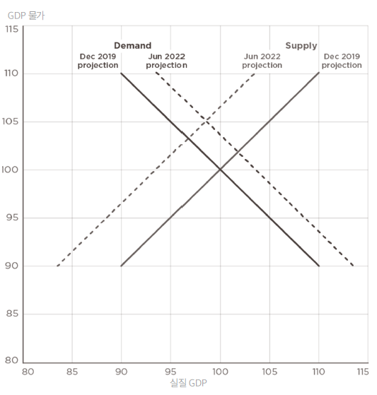 총수요가 증가하고 총공급이 축소됨에 따라, 예상했던 것보다 2022년 물가는 더 오르고 GDP는 더 내려갔다.