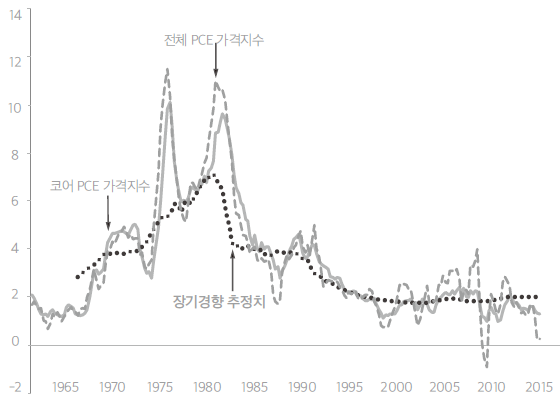 그래프를 자세히 살펴보면, 첫째, 연한 점선으로 표시된 ‘전체 PCE 가격지수’의 경우, 1970년대에 식품과 에너지 가격이 급상승하기 전에 이미 인플레이션율의 상향 움직임이 나타났다. 또한 실선으로 표시된 ‘코어 PCE 가격지수’ 역시, 이미 1960년대 중반에 상승하기 시작하며, 1970년대에 매우 높은 수준으로 올라갔다. 이는 1970년대의 인플레이션에 식량, 에너지 가격 충격 이상의 무언가가 있다는 뜻이다. 둘째, 진한 점선으로 표시된 ‘장기경향 추정치’는 통계적 모델에 따른 예측치로, 경제에 가해진 어떤 충격이 사라지면 인플레이션율이 복귀하리라 예측되는 값을 뜻한다. 그런데, 1960년대와 1970년대에 이러한 추정치가 높은 수준에 떠있었다. 이는 인플레이션율이 궁극적으로 복귀하리라 예상되는 낮은 수준의 안정적인 ‘안착점’(anchor)이 존재하지 않는다는 의미다. 셋째, 코어 인플레이션은 장기 추세 주변에서 변동한다.