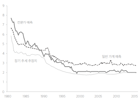 그렇다면, [그림4]에 대한 설명에서 언급한 것처럼 장기 추세를 결정하는 것은 무엇인가. [그림5]는 미래 인플레이션에 대한 (통계적) 추정치와 사람들(일반 가계와 전문가 각각)이 실제로 품고 있는 장기 인플레이션 기대를 조사한 값을 비교한 것이다. (예를 들어 미시간대학교의 소비자 조사는 500명을 대상으로 한 설문조사다.) 그로부터 1년 후의 인플레이션 기대 값과 5년 후의 인플레이션 기대 값을 구한다. 이를 보면, 인플레이션 기대가 실제 가격설정에서 중요한 역할을 한다는 사실을 알 수 있다. (대부분의 필립스 커브 이론은 인플레이션이 단기 인플레이션 기대에 의존한다고 제시하지만, 경험적으로 보면, 장기인플레이션 기대 값이 데이터와 더 잘 들어맞는다.) 또한 그 윤곽이 매우 유사하다. 이는 인플레이션 추세가 실제로 가계와 기업의 장기 인플레이션 기대와 연결된다는 사실을 보여준다. 이로부터 코어 인플레이션의 장기추세가 장기 기대 인플레이션에 의해 결정된다는 뉴케인지언 인플레이션 이론이 등장한다.